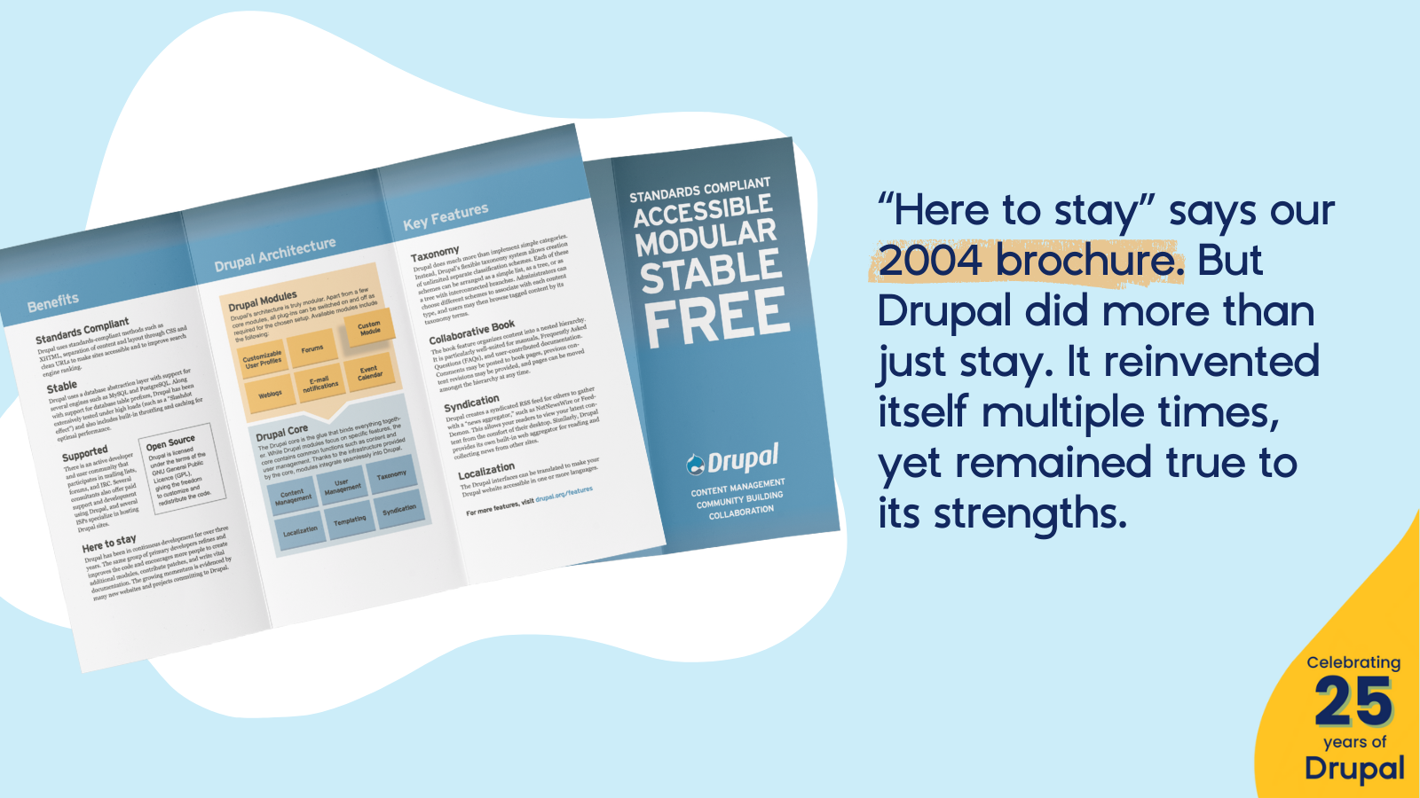 しかしDrupalは単にとどまっただけではなく、自身の強みには忠実であり続けながら、何度も自らを再発明しました。"